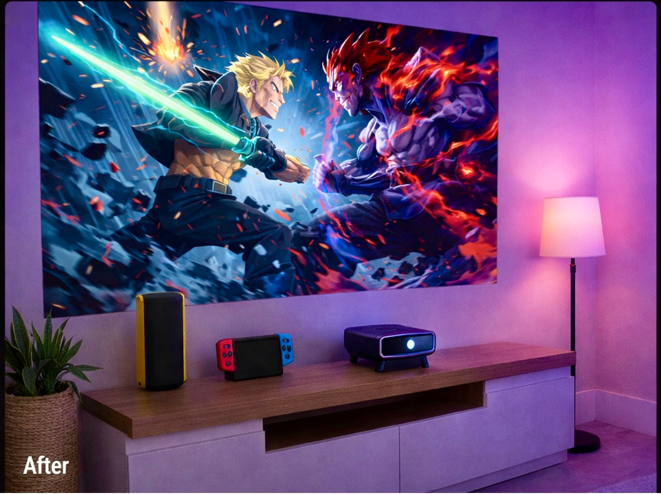 Experience true home and outdoor entertainment with a premium portable projector built for modern living. Our before and after comparison shows how quickly you can transform your living room, bedroom, or backyard into a stunning movie night sanctuary.